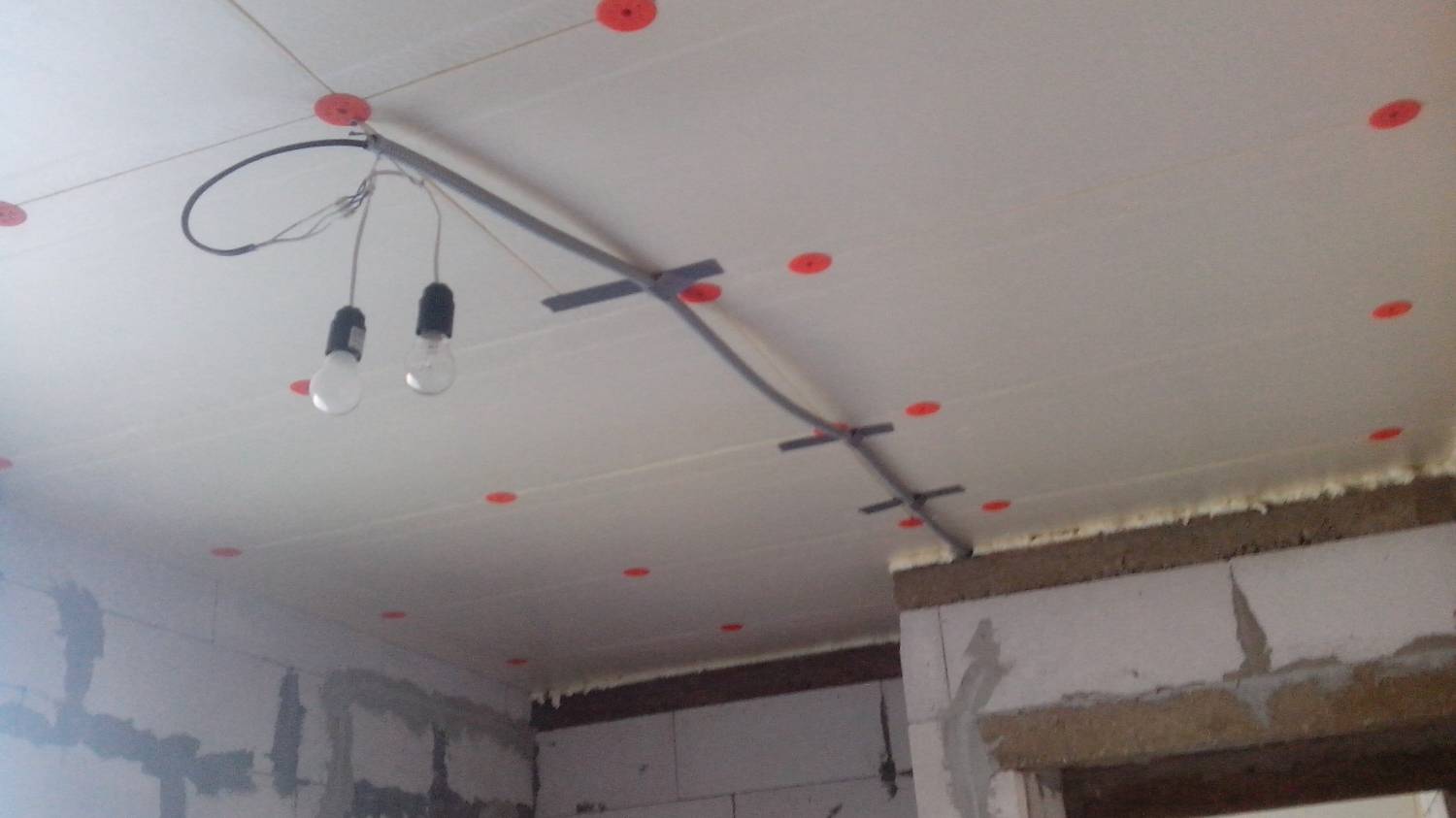 После летнего проживания, мы с женой определились где будут какие электрические точки. На фото видно, что кабель укладывал в металлическом рукаве.