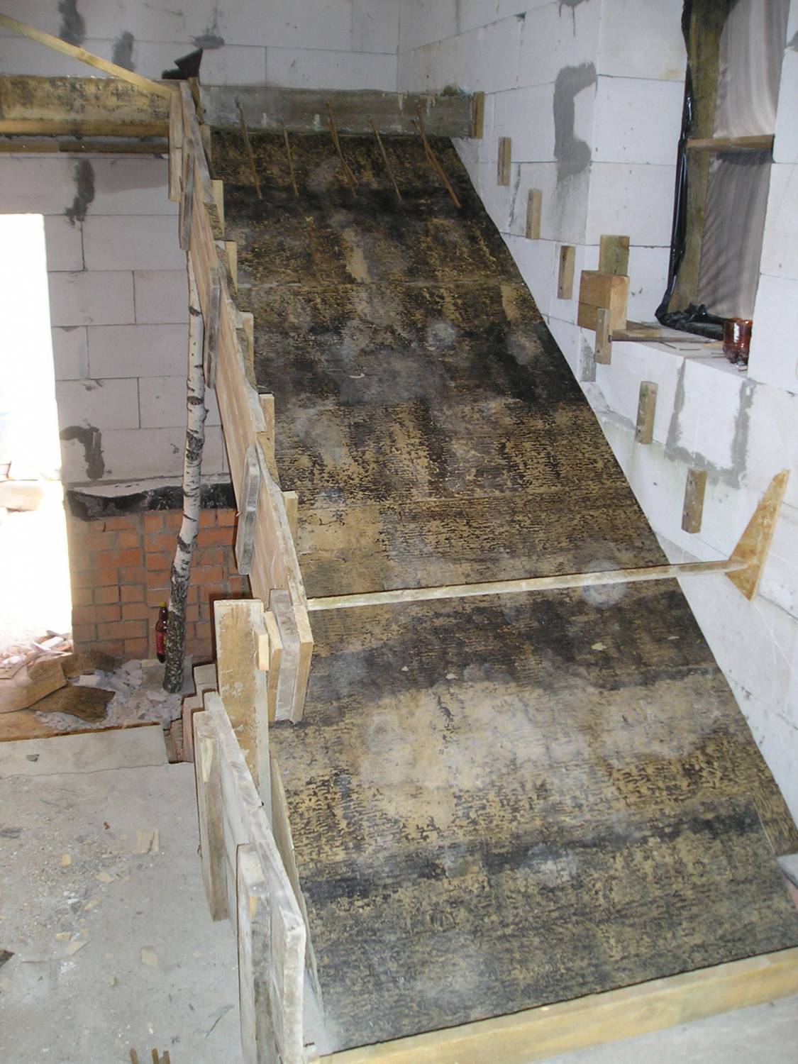 Учитывая, что сегодня воскресения, расслабляться некогда, хочется сегодня забетонировать данную лестницу. Старым рубероидом застилаю опалубку, это лучше чем целлофан, так как складок не должно быть, и при дальнейшей работе сложнее его испортить, т.е. порвать.
