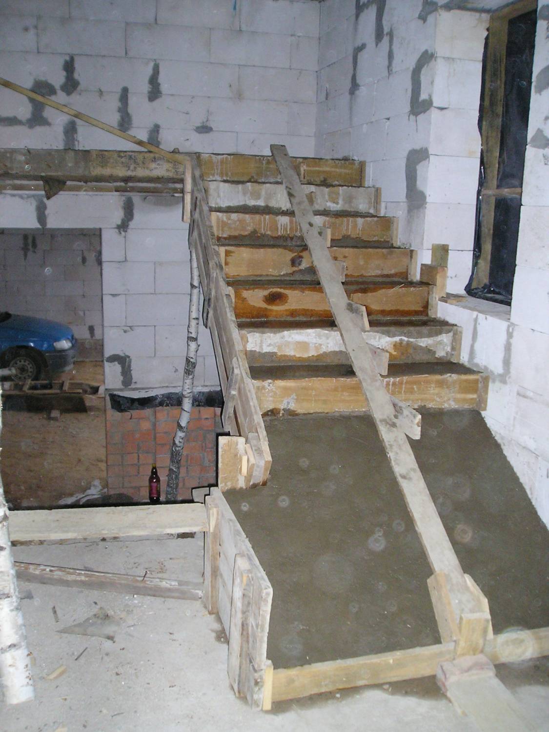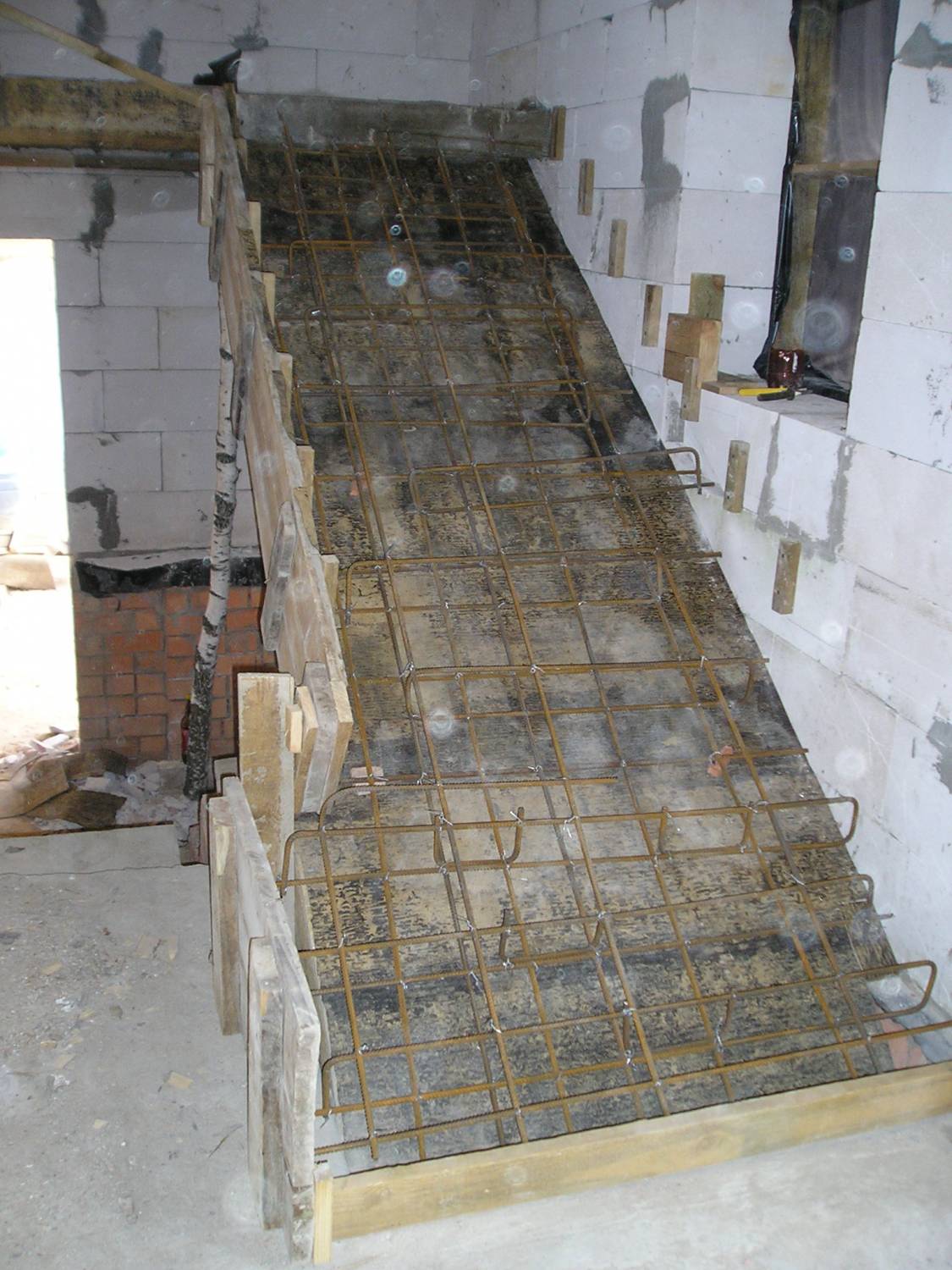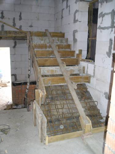 С низу видим лестница будет опираться на плиту, там делал отверстия и вбивал арматуру, и по боковым несущим стенкам.