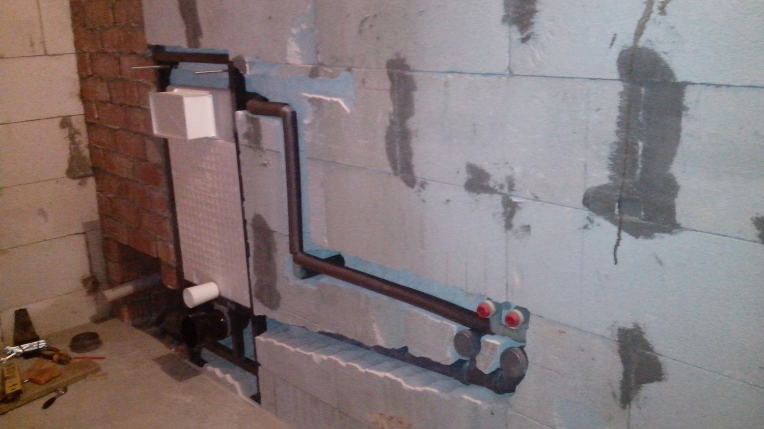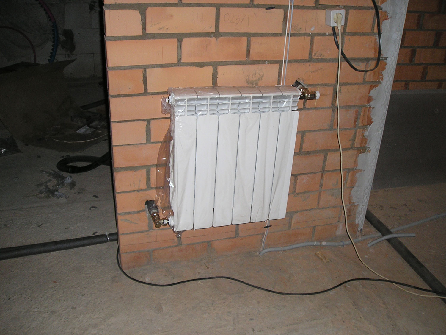 До штукатурки и стяжки провожу отопление. Трубы к батареям выходят из стены, чем частично усложняют монтаж. Надо точно знать, где будет чистовая стена.