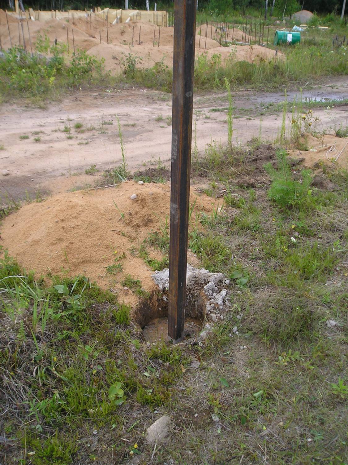 Столбики со стороны тех проезда, профильная труба 60*60*3 высота 3 м, без ушей, не окрашена. Над землёй 1,8-1,9 м.