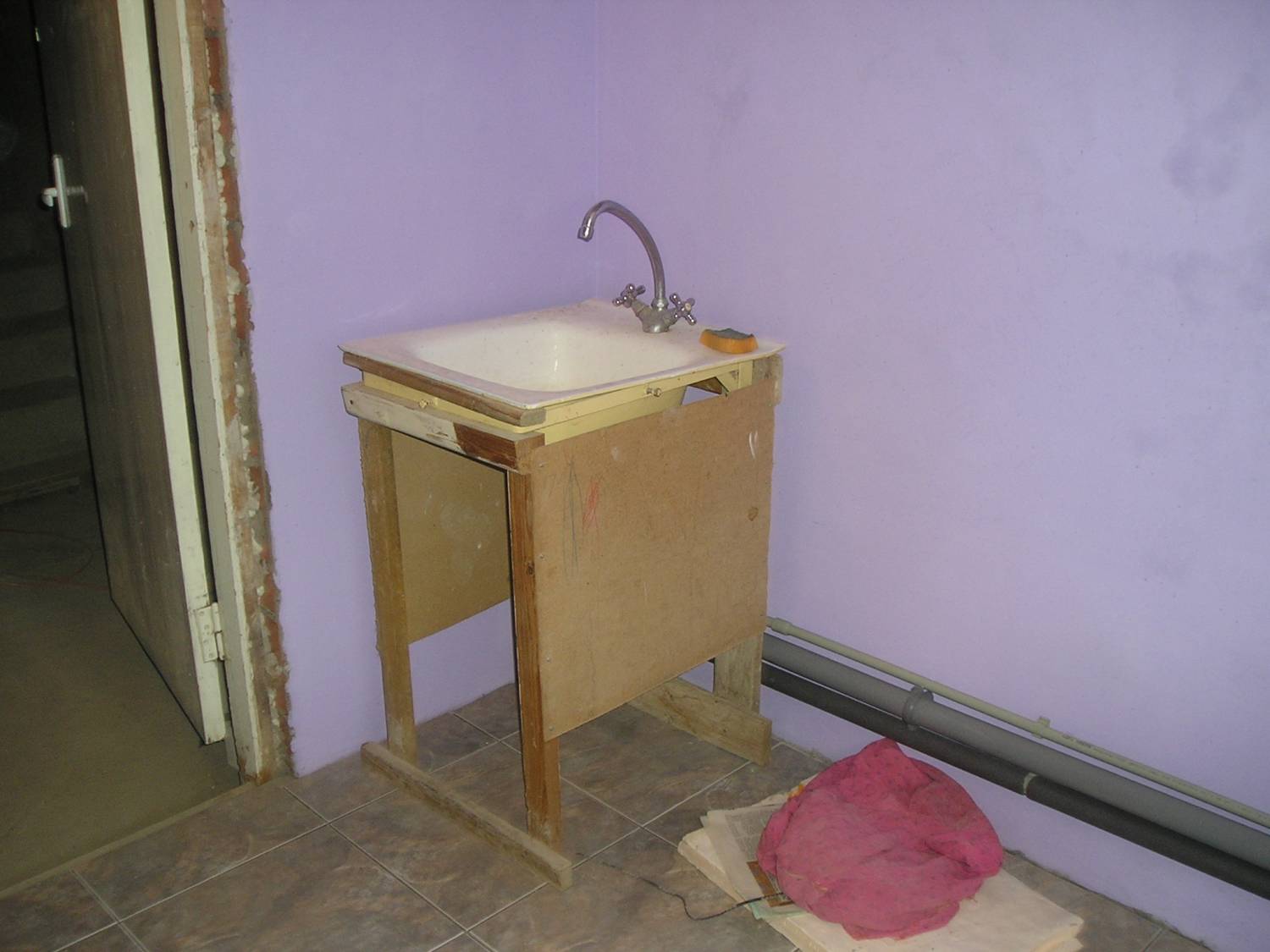 Вот мой универсальный умывальник, сколько раз он меня выручал. Левее него можно заметить временную дверь в котельную.