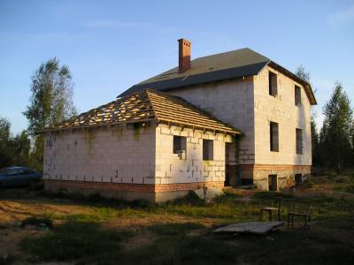 Вчера начал укладывать подкладочный ковёр в эркере, сегодня приехал роса, ждал пока высохнет, осталось только в вальмовых сторонах, окна и труб. Так же укрепил торцевые планки.